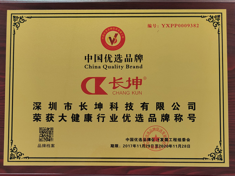 2017年12月,深圳市長坤科技有限公司成功被中國優(yōu)選品牌促進(jìn)發(fā)展工程選中,評(píng)選為“中國優(yōu)選品牌”,并授予其“大健康”行業(yè)優(yōu)選品牌稱號(hào),以茲鼓勵(lì)。